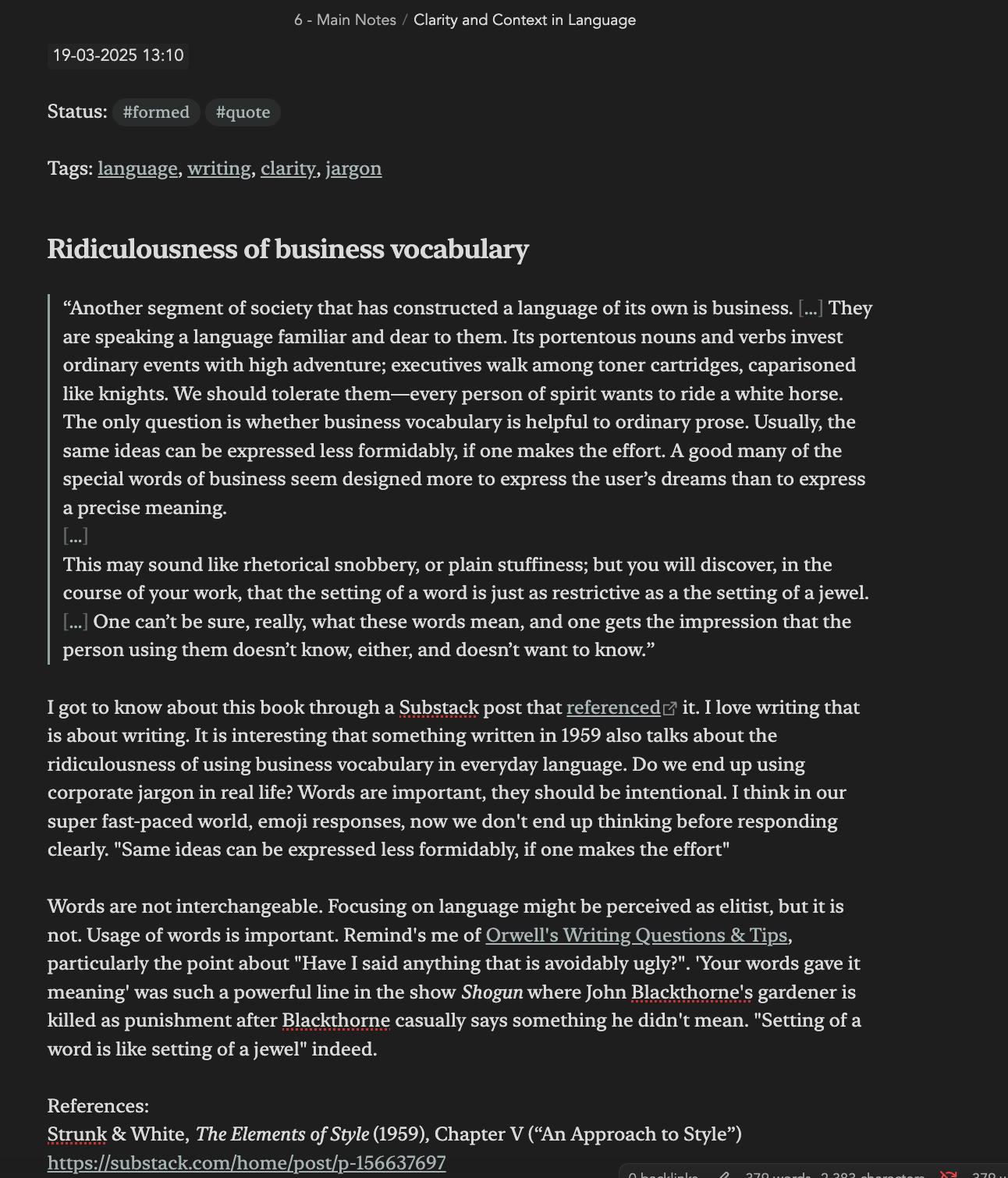 If it is an interesting idea from the book or show or article that appeals to me, I write a mini essay in my words to see if I have a grasp on the concept. You will be surprised at how often we can’t explain something we’ve just read or watched in our own words (it helps to talk and have discussions as well). For the mini-essay or detailed notes, I prefer to use my Obsidian app (example below) because I want to be able to use them in the future.